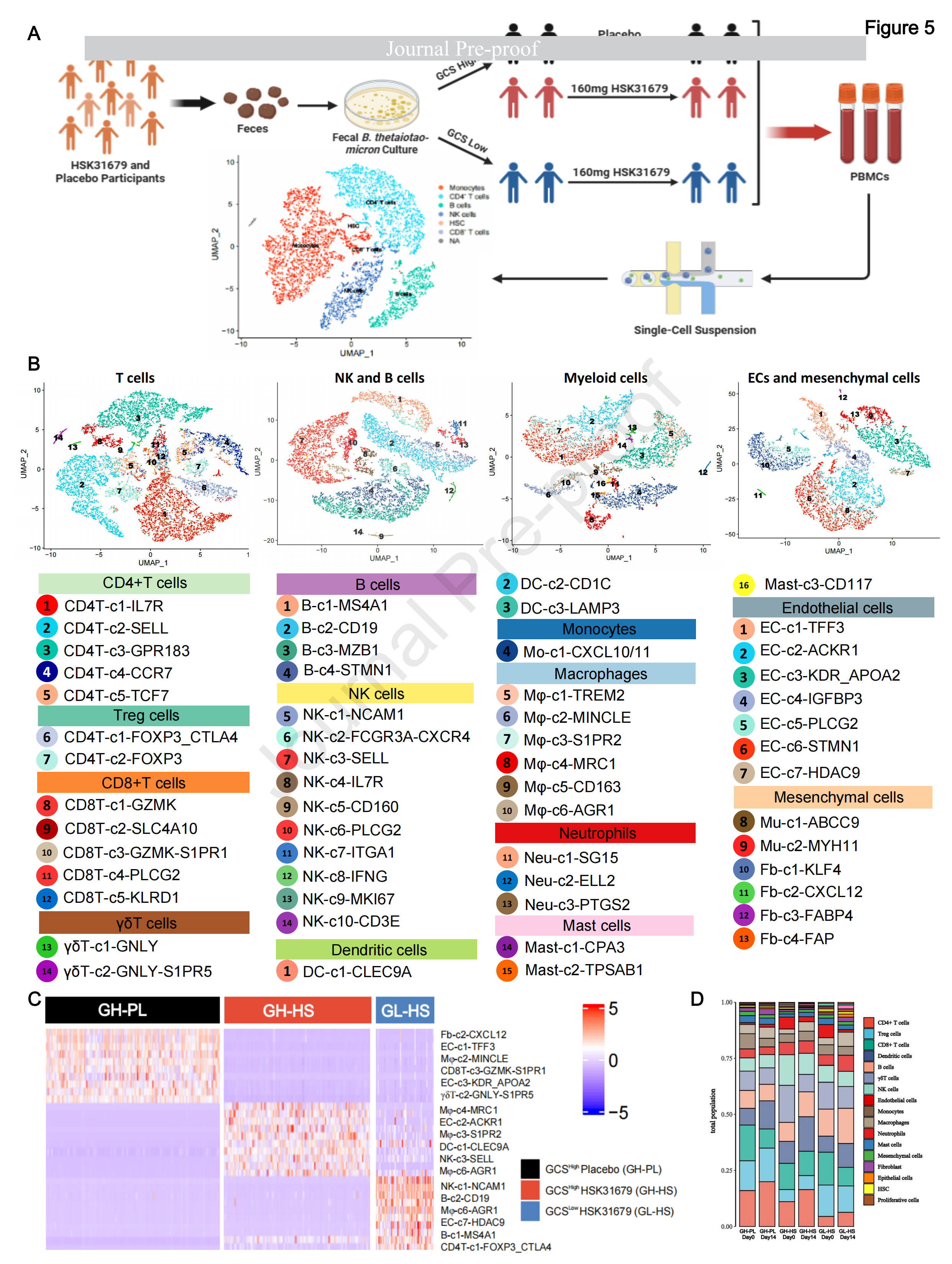 為了深入了解腸道微生物GCS在所有免疫細(xì)胞群中治療HSK31679的獨特免疫作用,研究者使用基于液滴的單細(xì)胞平臺(10×Genomics Chromium)進行了單細(xì)胞轉(zhuǎn)錄組測序(scRNA-seq),分析了來自參與者隊列的18個外周血單核細(xì)胞(PBMC)樣本,包括3個用安慰劑(GH-PL)治療的糞便來源GCS高活性樣本、3個用160 mg HSK31679(GH-HS)治療的糞便來源GCS高活性樣本,和GCS低活性樣本(GL-HS)分別在第0天和第14天。從GH-PL、GH-HS、GL-HS數(shù)據(jù)集中獲得的128031個細(xì)胞中,共鑒定出57個細(xì)胞簇。通過SingleR v.1.0獲得的基于標(biāo)記的注釋,定義了四種主要的細(xì)胞類型:T細(xì)胞、自然殺傷細(xì)胞(NK)和B細(xì)胞、髓系細(xì)胞、內(nèi)皮細(xì)胞(EC)和間充質(zhì)細(xì)胞(圖5B)。通過計算觀察到的細(xì)胞數(shù)與預(yù)期細(xì)胞數(shù)的比值(Ro/e)來量化主要細(xì)胞團相對不同的富集情況,發(fā)現(xiàn)髓系細(xì)胞團構(gòu)成了GH-HS的主要改變的細(xì)胞成分,B細(xì)胞、EC團主導(dǎo)了GL-HS樣本的細(xì)胞成分(圖5C、D和圖S8C)。鑒于如上所述,HSK31679治療通過B.thetaiotaomicron的GCS減輕了脂肪性肝炎,在隨后分析GH-HS和GL-HS之間的特定細(xì)胞區(qū)室時重點研究了髓系細(xì)胞。
