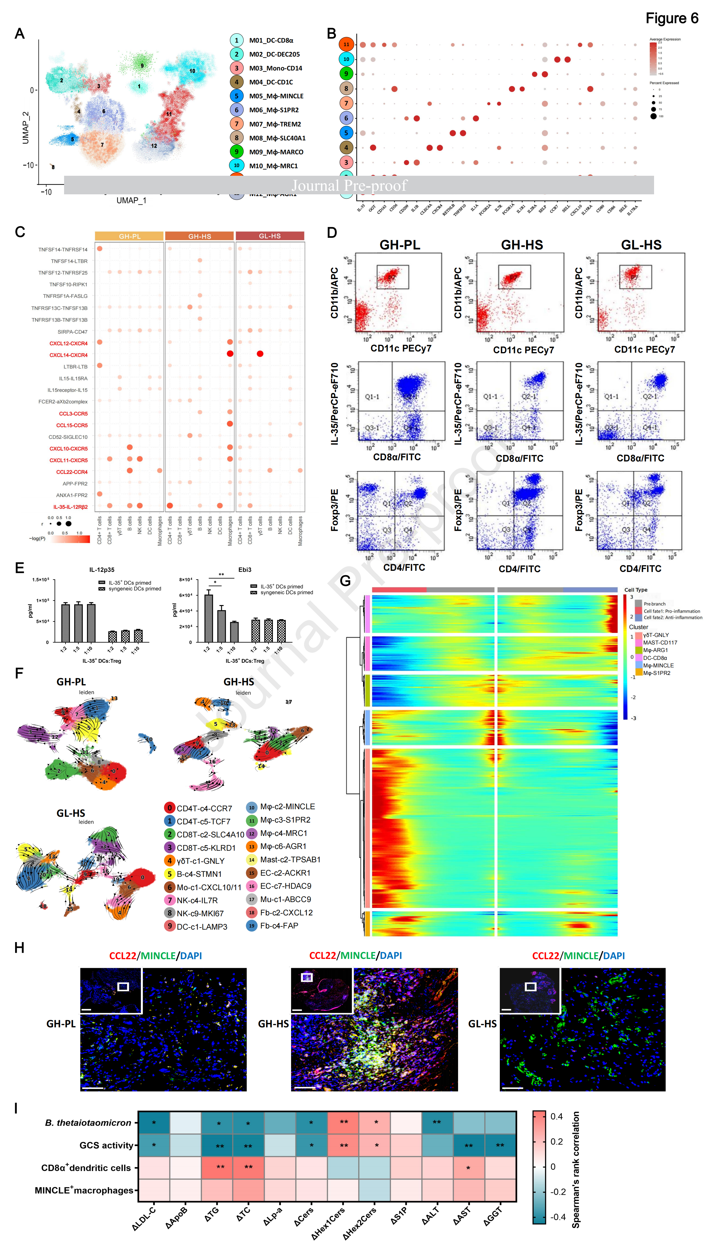 在所有髓系細(xì)胞亞群中,樹突狀細(xì)胞 (DC) 和巨噬細(xì)胞 (Mφ) 構(gòu)成了主要細(xì)胞類型(圖 5B)。通過無監(jiān)督聚類,首先關(guān)注 DCs 群體的內(nèi)在屬性和潛在功能,這些 DCs 群體被確定為減少的 CD8α+DCs(圖 6A、D)。值得注意的是,GH-HS 組中 Tregs 的 IL-12Rβ2 可以與 CD8α+DCs 衍生的 IL-35 相互作用(圖 6B、C)。如先前報道的那樣,可以增強炎癥過程的抑制功能。與GL-HS或GH-PL數(shù)據(jù)集相比,GH-HS的PBMCs中CD4+Foxp3+Tregs的數(shù)量增加(圖6D)。這些Tregs的抑制功能阻斷了IL-35的EBI3亞基的作用(圖6E),導(dǎo)致免疫原性顯著受損。這可能是由于STAT1/STAT3的異常激活和p38 MAPK/NF-κB信號通路的抑制(圖S8D和E)。此外,注意到DC簇的分布與γ-谷氨酰轉(zhuǎn)移酶(GGT)的表達相關(guān)(圖6B),GGT是MASH進展的公認(rèn)血清生物標(biāo)志物。在GH-HS的所有DC中(圖6A),GGT+樣本中CD1C+DCs(cDC2)的比例顯著增加,而與GL-HS或GH-PL組相比,DEC205+DCs(cDC1)的比例降低。盡管之前的研究報告了cDCs在促進或抑制脂肪性肝炎中的不確定作用,但結(jié)果表明,cDC1和cDC2細(xì)胞對HSK31679治療的反應(yīng)方式相反。