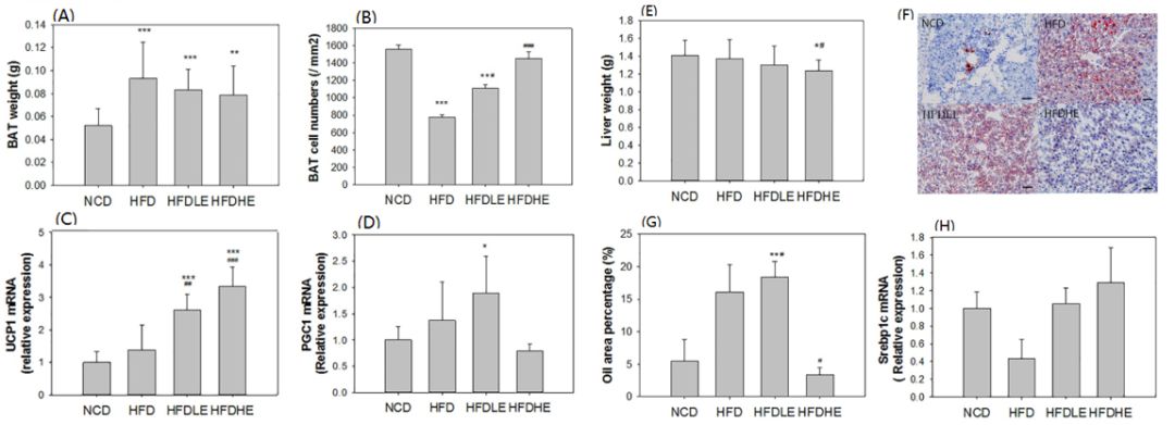 NLE未能顯著降低HFD導(dǎo)致的BAT增長(圖2A),與脂肪代謝有關(guān)的UCP1和PGC1基因表達(dá)在HFD-LE組中顯著升高(圖2C-2D),HFD-HE顯著降低了肝重(圖2E),NLE對(duì)HFD誘導(dǎo)的脂肪增生具有有效的抑制作用(圖2F-2G)。Srebp1c與肝脂肪的變性有關(guān),NLE對(duì)HFD導(dǎo)致的Srebp1c基因表達(dá)水平降低有恢復(fù)作用(圖2H)。