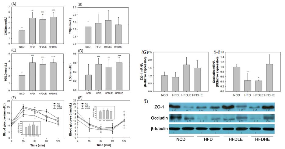 HFD-LE組、HFD-HE組均未顯著降低HFD導(dǎo)致的小鼠血清CHO、TG、LDL和HDL的升高(圖3A-3D)。緊密連接蛋白(ZO-1)和閉合蛋白是腸道上皮和屏障功能完整的重要生物標(biāo)志物,其表達(dá)的減少顯著細(xì)胞外通透性增加。高濃度的NLE(HFD-HE組)顯著恢復(fù)了HFD造成的閉合蛋白基因mRNA轉(zhuǎn)錄的降低(圖3H)。NLE對(duì)閉合蛋白基因表達(dá)影響的劑量依賴性在West Blot試驗(yàn)中也有體現(xiàn)(圖3I)。