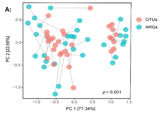 細(xì)菌群落多樣性分析表明,除自來水外,其他水環(huán)境樣品的平均Shannon指數(shù)均高于人類糞便樣品(圖5C)。PCoA分析表明,人類糞便和環(huán)境樣本之間的細(xì)菌群落組成有顯著差異(圖5D)。然而,在人類糞便和水環(huán)境中存在著167個(gè)OTUS屬121個(gè)常見細(xì)菌屬,此外,還發(fā)現(xiàn)ARGs與所有樣品中的細(xì)菌群落顯著相關(guān)(圖3A),這表明細(xì)菌群落組成決定了ARG組成,這一現(xiàn)象在各種環(huán)境中都被廣泛觀察到。