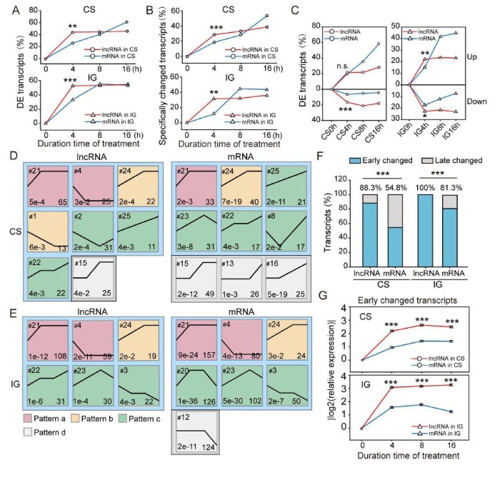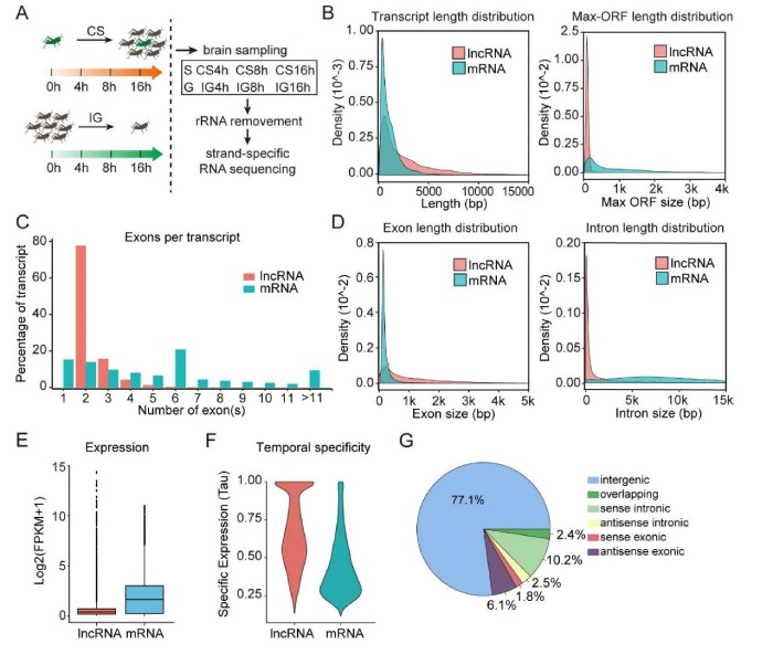 為了進一步分析lncRNA和mRNA的表達模式,使用了短時間序列表達挖掘器(ShortTime-seriesExpressionMiner,STEM)對基于表達的轉(zhuǎn)錄本進行聚類。在CS期間,將214個lncRNA和242個mRNA分別分為8個和9個重要的表達譜(圖3D)。其中l(wèi)ncRNA表達譜15以及mRNA表達譜15、13和16直到群居化處理后8或16小時才改變。這些配置文件稱為后期更改的配置文件(模式d)。與后期更改的配置文件相反,早期更改的配置文件以4小時時間點開始的轉(zhuǎn)錄表達變化為特征。根據(jù)4小時后的表達變化,將早期變化的輪廓細分為模式a(早期變化)、模式b(早期中變化)和模式c(可持續(xù)變化)。在IG過程中,269個lncRNA和639個mRNA分別聚集成6個和7個顯著表達譜。所有l(wèi)ncRNA配置文件均為早期變化(圖3E)。在mRNA表達譜中,有6個是早期改變的,而譜12是晚期改變的。在CS和IG期間,lncRNA的聚類分布圖的數(shù)量與mRNA的分布無明顯差異。但是,通過計算譜圖中的轉(zhuǎn)錄本數(shù)量,發(fā)現(xiàn)早期改變的lncRNA的百分比比CS中的mRNA的百分比高61.1%(88.3%vs.54.8%,圖3F)。同樣,IG中早期改變的lncRNA的百分比高于IG中的mRNA(100%vs.81.3%,圖3F)。因此,lncRNA比mRNA對散居化和群居化處理的反應(yīng)更快。在CS中,早期改變的lncRNA的表達變化速率快于285個mRNA的表達變化速率(0.55vs.0.24)和IG(0.77vs.0.39)(圖3G)。因此,早期改變的lncRNA的比例和表達變化率高于早期改變的mRNA。因此,蝗蟲lncRNA比mRNA對種群密度的變化更敏感。