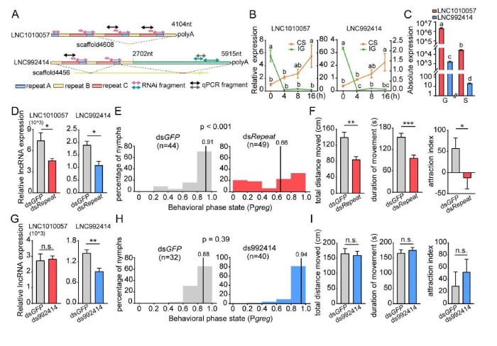 為為了驗證LNC1010057和LNC992414在蝗蟲型變中的功能,進行了一系列分子生物學(xué)實驗。首先,克隆了在LNC1010057和LNC992414基因座中鑒定出的長的轉(zhuǎn)錄本。LNC1010057由重復(fù)的A、B和C元素組成,這些元素依次分布并重復(fù)4次,但C元素重復(fù)三次(圖5A)。序列比對證明LNC992414在5’端與LNC1010057共享相似的重復(fù)序列,但是它們是從不同的基因組基因座轉(zhuǎn)錄而來的(圖5A)。盡管LNC992414的定量表達水平可以通過特異性引物檢測,但LNC1010057的表達水平為重復(fù)元件的總表達水平。如預(yù)期的那樣,LNC1010057和LNC992414的表達模式極為相似。在CS期間,兩種lncRNA的表達持續(xù)增加,并且在16h幾乎增加了四倍(圖5B)。在IG期間,4h后表達水平顯著下降,之后保持相對穩(wěn)定(圖5B)。LNC1010057和LNC992414之間的序列結(jié)構(gòu)和表達模式的相似性表明它們是同源的lncRNA。但是,實時qPCR分析表明,在散居型和群居型蝗蟲的大腦中,LNC1010057的表達水平比LNC992414的表達水平高約1000倍(圖5C)。其次,為了測試LNC1010057和LNC992414是否參與蝗蟲型變調(diào)節(jié),在通過RNAi抑制蝗蟲大腦中的表達后進行了行為分析。顯著降低LNC1010057的表達水平(7470對3764610)和LNC992414(1.9vs.1.0)(圖5D)后行為分析表明,群居型蝗蟲其行為顯著改變?yōu)樯⒕訝顟B(tài)(圖5E)。此外,多個與型有關(guān)的行為參數(shù)發(fā)生了變化。總移動距離(TDM)和總移動持續(xù)時間(TDMV)顯著降低(圖5F),但是,移動速度沒有區(qū)別。同時群居蝗蟲的特定喜好行為顯著下降(58.3對-13.5圖5F)。但LNC992414表達降低并未引起從群居狀態(tài)到散居狀態(tài)的轉(zhuǎn)變(圖5G和H)。與對照相比,與型相關(guān)的行為參數(shù)(包括運動和特定物種的優(yōu)選行為)沒有差異(圖5I)。LNC992414的RNAi實驗不會引起行為變化,因此排除了LNC992414調(diào)節(jié)蝗蟲型變的可能性。這些結(jié)果表明是LNC1010057而不是LNC992414潛在地調(diào)節(jié)了蝗蟲的型變。