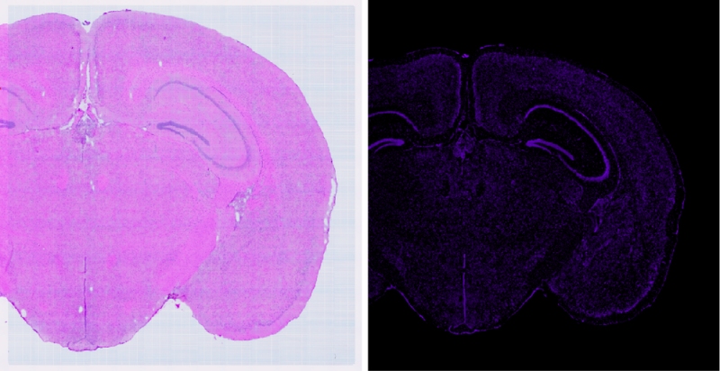 可以利用BH1000對(duì)明場(chǎng)及熒光掃描過(guò)程中經(jīng)常出現(xiàn)的拼接錯(cuò)誤進(jìn)行校準(zhǔn)(自主研發(fā)BMCHiper軟件,搭配自研半透半返模塊,實(shí)現(xiàn)圖像無(wú)錯(cuò)校準(zhǔn)),得到原片無(wú)錯(cuò)高清的熒光圖像與原片無(wú)錯(cuò)高清的明場(chǎng)圖像,為后續(xù)空間數(shù)據(jù)準(zhǔn)確的定位和可視化提供基礎(chǔ),使得復(fù)雜的轉(zhuǎn)錄組數(shù)據(jù)能夠轉(zhuǎn)化為最直觀,最精準(zhǔn)的生物學(xué)見解。