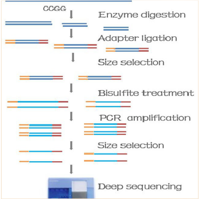 簡化甲基化測序(Reduced representation bisulfite sequencing,RRBS)主要針對(duì)CpG富集的區(qū)域的甲基化研究方法,它依據(jù)限制性內(nèi)切酶酶切手段將DNA酶切成小片段,選取特定片段大小的序列進(jìn)行重亞硫酸鹽測序分析,旨在評(píng)估CpG甲基化水平。