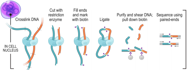 Hi-C(High-throughput chromosome conformation capture)是染色質構象捕獲結合高通量測序衍生的一種技術,實現了全基因組范圍內的染色體片段間相互作用的捕獲。Hi-C互作主要是將空間結構鄰近的DNA片段進行交聯,并富集交聯的DNA片段,然后進行高通量測序,對測序數據進行分析即可揭示染色體片段間的交互作用,闡述染色體三維構象,廣泛應用于腫瘤/疾病發(fā)生發(fā)展機制、分化發(fā)育機制、畸變機制等研究。