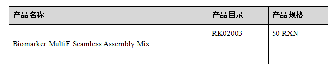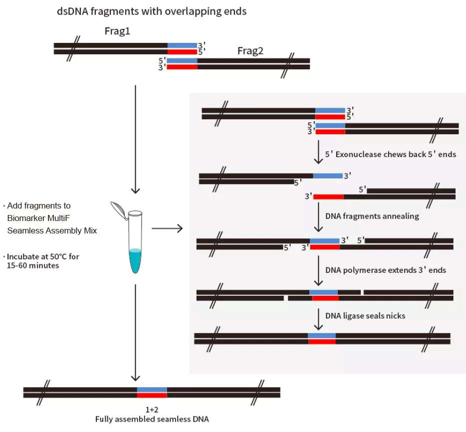 Biomarker MultiF Seamless Assembly Mix是一種簡單、快速高效的DNA無縫克隆技術(shù),可將插入片段定向克隆至任意載體的任意位點(diǎn)。將載體進(jìn)行線性化;在插入片段正/反向PCR引物5?端引入線性化載體的末端序列;PCR產(chǎn)物5?和3?最末端分別帶有和線性化載體兩末端一致的同源序列(Overlaps,15~25?bp);這種兩端帶有載體末端序列的PCR產(chǎn)物和線性化載體按一定比例混合后,在特定酶混合物的催化下,50?℃反應(yīng)15~60?min即可進(jìn)行轉(zhuǎn)化,完成定向克隆。