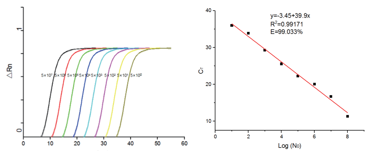 圖1:將質(zhì)粒進(jìn)行8 個(gè)10倍梯度稀釋,以5×107 -100?拷貝/μl的質(zhì)粒為模板,進(jìn)行擴(kuò)增。發(fā)現(xiàn)Biomarker 2× SYBR Green Fast qPCR Mix擴(kuò)增效率高,且可獲得良好的線性關(guān)系。