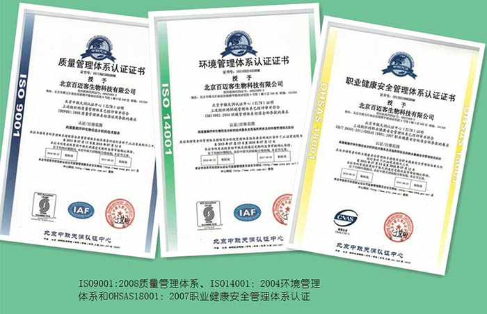 近日,北京百邁客生物科技有限公司順利通過(guò)ISO9001:2008質(zhì)量管理體系、ISO14001:2004環(huán)境管理體系和OHSAS18001:2007職業(yè)健康安全管理體系認(rèn)證(簡(jiǎn)稱(chēng)QES),這標(biāo)志著公司向管理標(biāo)準(zhǔn)化、規(guī)范化和程序化方向發(fā)展邁進(jìn)了一大步。