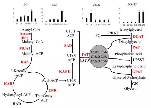藻類和植物中脂肪酸的生物合成主要在葉綠體中進(jìn)行。乙酰-CoA作為合成的起始物質(zhì)?;谵D(zhuǎn)錄組測序,小球藻質(zhì)體中脂肪酸合成基因被鑒定到。在葡萄糖處理情況下,這些基因大都表達(dá)量上調(diào)。另外這次測序結(jié)果中還發(fā)現(xiàn)幾個基因?qū)?yīng)的不同轉(zhuǎn)錄本。由于BC和SAD是脂肪酸合成的限速酶基因,做了進(jìn)一步分析,發(fā)現(xiàn)BC和SAD表達(dá)量從6h到72h表達(dá)量持續(xù)上升,對應(yīng)的三酰甘油含量從24h到96h持續(xù)增加。
