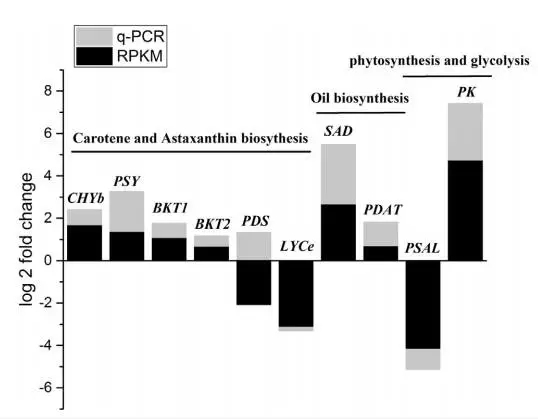作者選了10個與蝦青素和三酰甘油合成有關(guān)的unigenes進(jìn)行了RT-PCR驗(yàn)證,其中9個基因的表達(dá)趨勢與RNA-seq結(jié)果一致。只有PDS兩種結(jié)果不同,可能是RNA-seq結(jié)果不準(zhǔn)確,因?yàn)榍叭说难芯砍晒校咸烟鞘巧险{(diào)PDS表達(dá)的,與本文中RT-PCR結(jié)果一致。