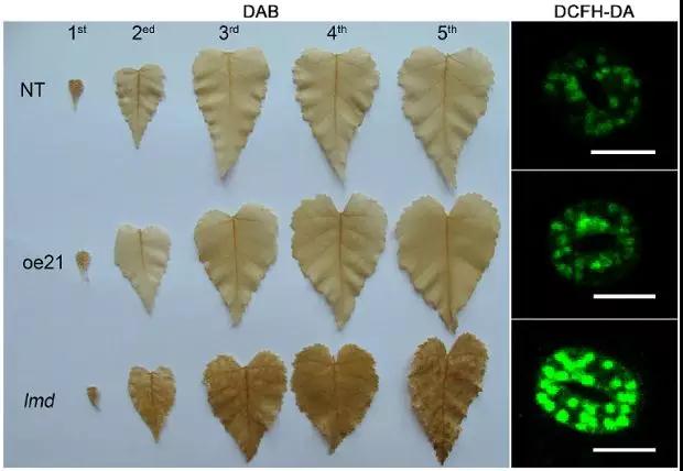 作者在研究BpGH3.5在樺樹中的功能時(shí)偶然獲得了lmd突變體。構(gòu)建的21株OE-GH3.5株系中,唯獨(dú)lmd葉片表現(xiàn)出壞死斑點(diǎn)并伴有早衰的現(xiàn)象。這很明顯是一種病變的表現(xiàn),當(dāng)這種情況出現(xiàn),很顯然我們要思考兩個(gè)問(wèn)題: