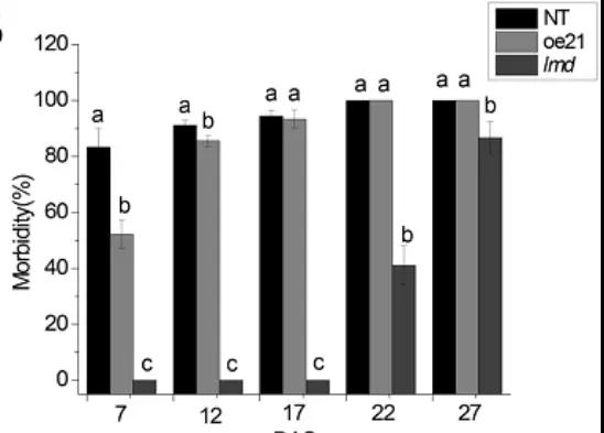 研究發(fā)現(xiàn)類病變突變體增強(qiáng)了對(duì)病原菌的抗性,為了測(cè)試lmd突變體是否對(duì)Alternaria alternata有抗性,作者將孢子懸浮液噴灑在NT、oe21和lmd幼苗上。7天之后,NT和oe21感染嚴(yán)重,出現(xiàn)了幾片枯萎葉片,而在lmd突變體中觀察到的枯萎葉片很少,盡管其葉片上有許多病變(圖11)。噴施17天后,NT和oe21的發(fā)病率均在90%以上,但lmd仍未出現(xiàn)感染葉片。lmd的發(fā)病時(shí)間出現(xiàn)在噴灑后22天,而此時(shí),lmd的發(fā)病率為45.55%,但NT和oe21的發(fā)病率均為100%(圖12)。