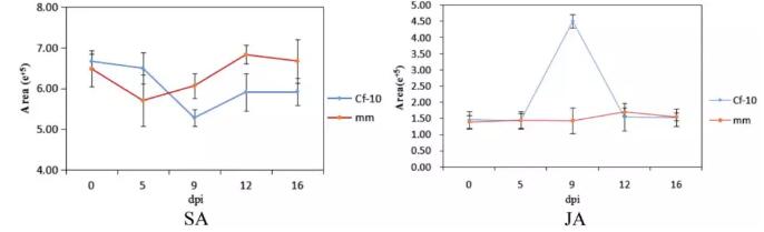 3)如圖3所示, Ontario 792中,SA含量剛開始緩慢下降,然后緩慢上升直到16 dpi。Moneymaker中,SA含量在5 dpi下降至最低水平,然后逐漸增加直到12 dpi。Ontario 792中,從5 ~ 9 dpi JA含量迅速上升到峰值,然后從9到12dpi下降到原始水平,但Moneymaker中始終保持相對穩(wěn)定,表明JA可能參與激活對C. fulvum的防御系統(tǒng)。