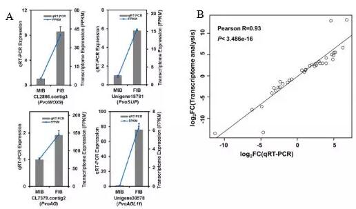 本研究中,挑選了36個(gè)基因用qRT-PCR驗(yàn)證,表達(dá)趨勢(shì)和轉(zhuǎn)錄組一致,且兩種數(shù)據(jù)的相關(guān)性達(dá)到0.93。