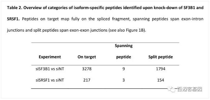 肽段數(shù)量上的差別直接和兩個(gè)實(shí)驗(yàn)剪接isoform數(shù)據(jù)庫的數(shù)目相關(guān)??偟膩碚f,大約60%的isoform特異肽段會比對到目標(biāo)區(qū)域,跨越exon-econ junction的split 肽段約占40%,跨越 exon-intron junctions 的spanning肽段則很少被發(fā)現(xiàn)(如表2所示)。