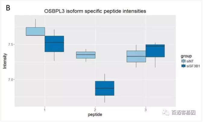 約65%的顯著差異表達(dá)的splice-specific-peptides在RNA水平上表現(xiàn)出一致的表達(dá)差異。例如,下調(diào)SF3B1的實(shí)驗(yàn)組中,OSBPL3 9號外顯子中分別有3個(gè)支持外顯子保留和1個(gè)支持外顯子去除的peptides被鑒定出來。兩種inclusion specific-peptides表達(dá)明顯較低,而exclusion specific -peptides則與對照相比表現(xiàn)出較高的表達(dá)量(如圖5所示)。