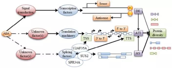FY Zhu[3]等通過轉(zhuǎn)錄組和蛋白組的聯(lián)合分析揭示了擬南芥在脫落酸響應(yīng)中的可變剪接和翻譯的分子機(jī)制,結(jié)果中發(fā)現(xiàn)相比于基因的差異表達(dá),發(fā)生差異可變剪接的基因功能多集中在三羧酸循環(huán)、光合作用等途徑,表明在對ABA響應(yīng)中,相對基因表達(dá),轉(zhuǎn)錄本的結(jié)構(gòu)變化可能起更為重要的作用,且差異可變剪接事件更容易翻譯成蛋白行使生物學(xué)功能。