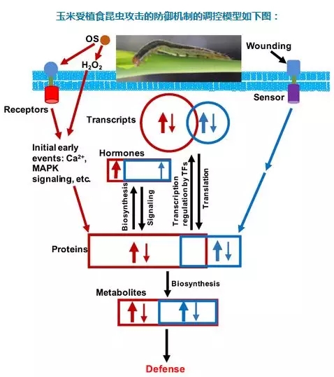 Qi J[4]等,利用多組學(xué)(轉(zhuǎn)錄組學(xué)、蛋白組學(xué)、代謝組學(xué))技術(shù),探索了玉米受植食昆蟲攻擊的防御機(jī)制,并構(gòu)建繪制了系統(tǒng)的調(diào)控模型。這些數(shù)據(jù)對玉米防御昆蟲災(zāi)害的進(jìn)一步遺傳學(xué)研究搭建了很好的框架,也為抗昆蟲災(zāi)害的玉米新品種的培育奠定了良好的基礎(chǔ)。
