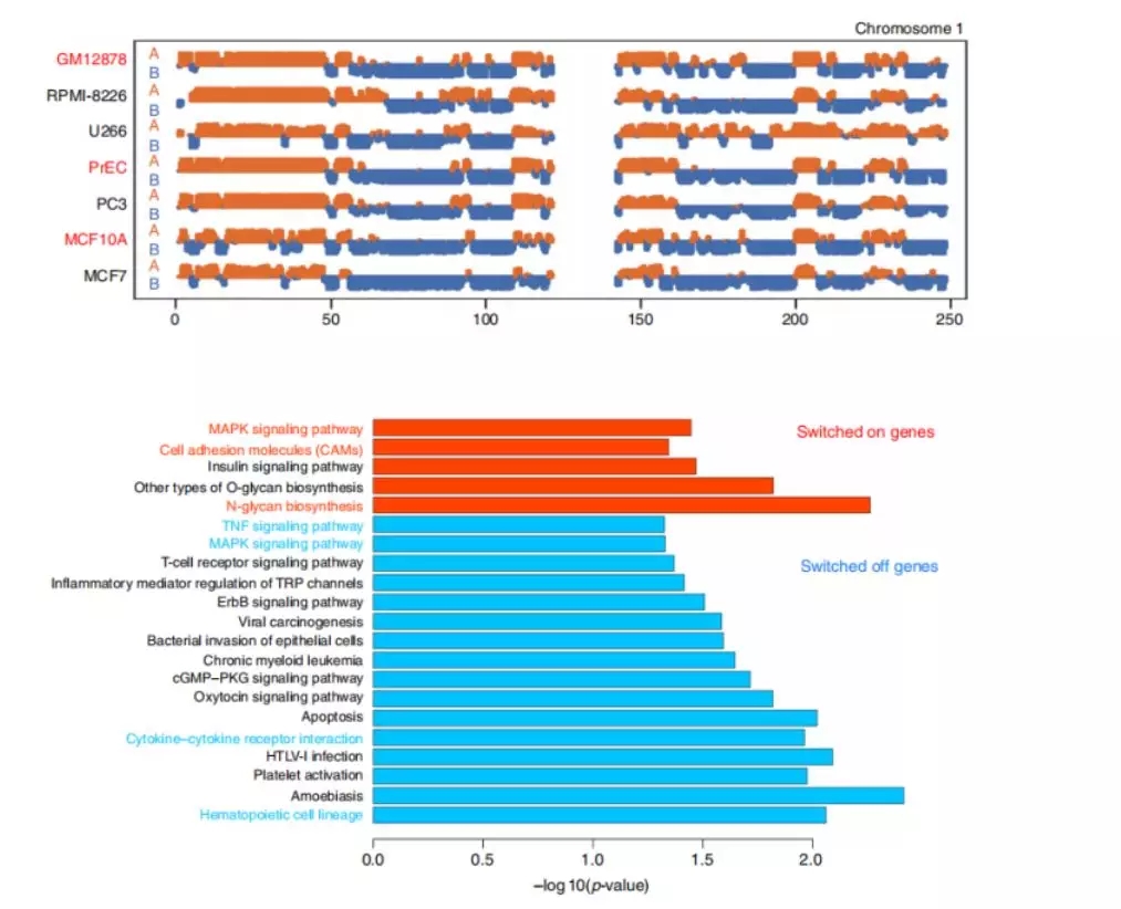 例如在人的多發(fā)性骨髓瘤文章中,作者利用正常B細(xì)胞(GM12878)和兩種亞型的骨髓瘤細(xì)胞(近二倍體U266和近三倍體RPMI-8226)進(jìn)行Hi-C、WGS和RNA-seq測序,結(jié)果發(fā)現(xiàn),相比于GM12878,U266和RPMI-8226癌癥細(xì)胞中6%的區(qū)域均存在B轉(zhuǎn)換到A,1%的區(qū)域均存在A轉(zhuǎn)換到B,結(jié)合RNA-seq數(shù)據(jù),發(fā)現(xiàn)B轉(zhuǎn)換到A區(qū)域內(nèi)的基因變成轉(zhuǎn)錄活躍狀態(tài),而A轉(zhuǎn)換到B區(qū)域內(nèi)的基因變成轉(zhuǎn)錄抑制狀態(tài),KEGG富集通路發(fā)現(xiàn)這些基因與多發(fā)性骨髓瘤相關(guān),主要涉及MAPK信號轉(zhuǎn)導(dǎo)途徑、TNF信號轉(zhuǎn)導(dǎo)途徑、細(xì)胞因子和細(xì)胞因子受體相互作用途徑等,進(jìn)一步在染色體2q11.2-q12.142處發(fā)現(xiàn)一個(gè)細(xì)胞因子基因簇,幾種白細(xì)胞介素IL1R1,IL1R2,IL18R1和細(xì)胞因子MAP4K4下調(diào)表達(dá),這些基因在后續(xù)研究中重點(diǎn)關(guān)注。