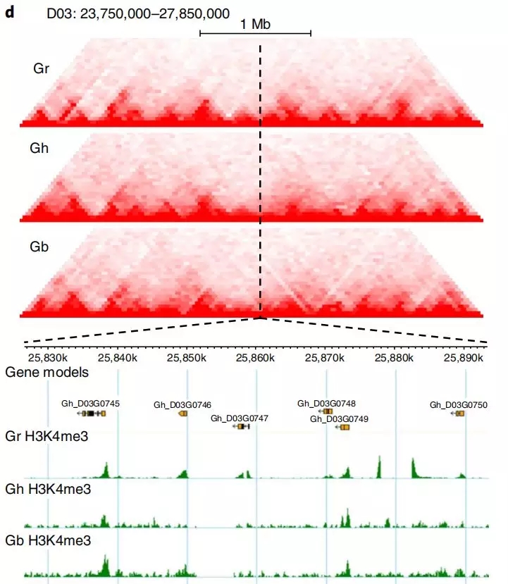 例如,在棉花的三維基因組進(jìn)化文章中,作者對二倍體雷蒙德氏棉、二倍體亞洲棉、四倍體陸地棉和四倍體海島棉構(gòu)建了三維基因組圖譜,與雷蒙德氏棉D(zhuǎn)03染色體相比,陸地棉和海島棉對應(yīng)的D亞基因組中發(fā)生了染色質(zhì)重排,虛線對應(yīng)的TAD結(jié)構(gòu)發(fā)生了變化,雷蒙德氏棉中該TAD結(jié)構(gòu)完整,存在明顯的邊界,陸地棉中該邊界發(fā)生了左移,而海島棉中該TAD趨向于消失。因而通過鑒定TAD發(fā)生變化區(qū)域的基因,可以研究多倍化過程中基因表達(dá)調(diào)控的改變(研究多倍體的老師們,這可是一個(gè)很好的套路文章哦)。同時(shí)結(jié)合ChIP-seq數(shù)據(jù)對該TAD邊界進(jìn)行分析發(fā)現(xiàn),雷蒙德氏棉富含豐富的H3K4me3(活性染色質(zhì)標(biāo)記),而陸地棉和海島棉中H3K4me3顯著減少,說明在棉花的多倍化與表觀遺傳修飾存在密切關(guān)聯(lián)。