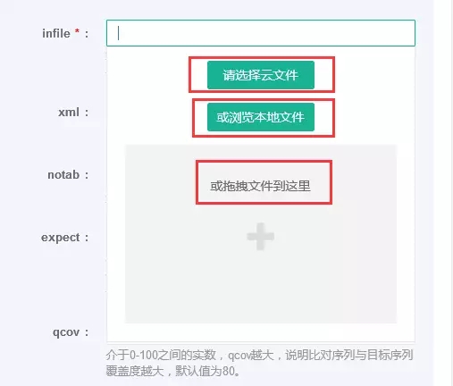 infile :在輸入比對的序列文件時,有三種方式,包括選擇云文件、瀏覽本地文件或拖拽文件