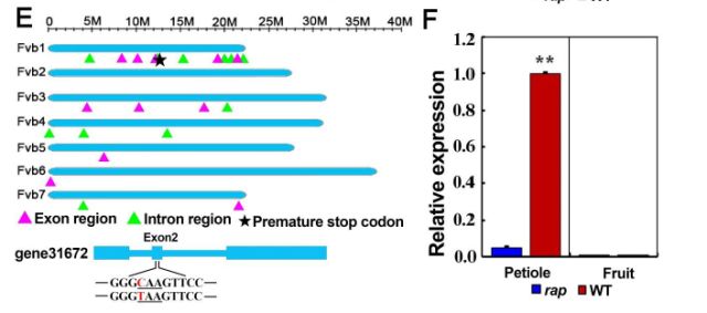 作者利用ENU誘變產(chǎn)生了綠色葉柄和葉片的突變體rap,相較與野生型YW5AF7,rap表皮細胞的色素沉著大大減少,葉柄的橫截面脈管系統(tǒng)周圍皮層細胞中顯示出相同的變化,且與色素減少表型相一致的是rap葉片葉柄中總花青素含量顯著降低(P <0.01),rap和YW5AF7對照果實中花青素含量都極低(圖1)。通過對已知花青素合成途徑相關(guān)基因表達及測序分析,RAP為一新基因參與花青素的積累,調(diào)控草莓的生長發(fā)育。