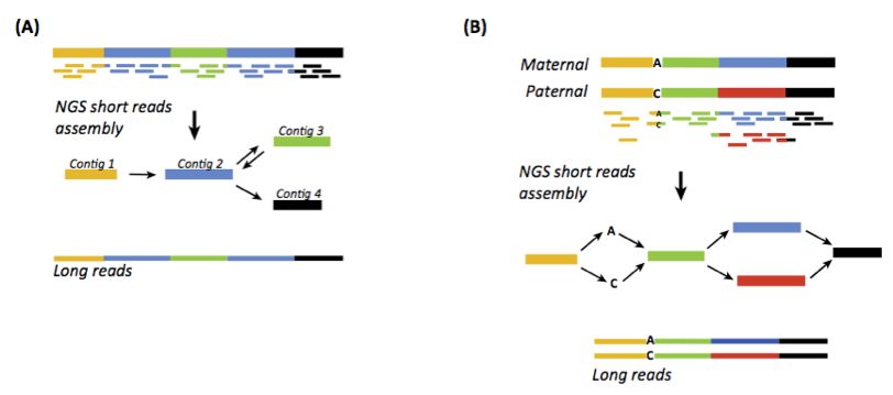 圖1 三代Nanopore測序Long reads解決高重復(fù)(A)和高雜合(B)基因組組裝[1]