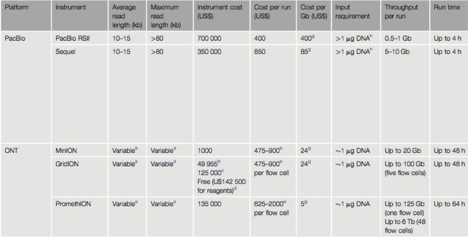 圖4 三代測序平臺PacBio和ONT測序平臺的比較[1]