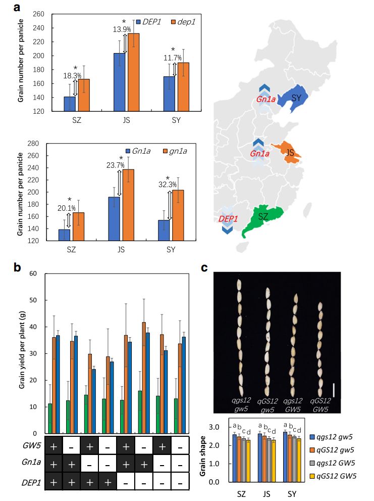 為了揭示生態(tài)環(huán)境與遺傳背景對基因功能的影響,首先,作者發(fā)現(xiàn)Gn1a對水稻單穗籽粒數(shù)目的貢獻主要集中在江蘇與沈陽兩個實驗點,而DEP1僅僅在深圳被檢測到是控制單穗籽粒數(shù)目的QTL(圖6)。對以上三個種植區(qū),又進一步比較攜帶有 DEP1/dep1與Gn1a/gn1a的不同水稻材料,結(jié)果發(fā)現(xiàn)在高緯度生態(tài)區(qū)dep1對單穗籽粒數(shù)目的貢獻減少,而gn1a對其貢獻明顯增強(圖6)。類似地,DTH8、 SDG708與PHYB在江蘇均被檢測到,而PHYB在深圳也被檢測到,同樣, DTH8、 SDG708在沈陽也被檢測到;結(jié)果顯示DTH8、SDG708幾乎不會影響在深圳的抽穗期,PHYB在沈陽有較弱的作用(圖6)。概括起來,Gn1a、 SDG708、SD1與GW5的功能在高緯度地區(qū)被增強,另一方面,PHYB與DEP1的功能隨著緯度的北移被破壞,有趣的是,DTH8在中緯度地區(qū)具有較強的功能,緯度的南移或北移都會削弱其功能。