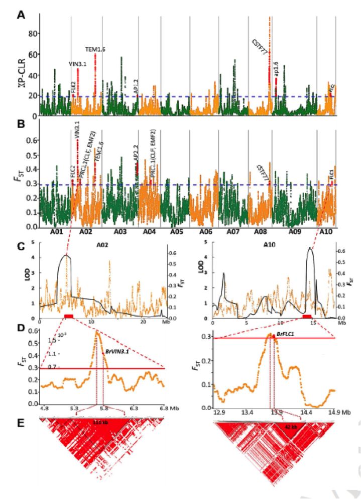 構(gòu)建了一個遺傳圖譜進行QTL定位以找到抽薹時間相關的區(qū)域,一共找到了7個QTLs,其中QTLs ftA02.1 and ftA10.1被發(fā)現(xiàn)在受選擇的兩個候選區(qū)域內(nèi)。通過多年對表型變化影響的反復檢測,推測它們參與了抽薹時間的調(diào)控。