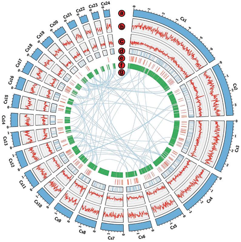 使用CANU從頭組裝測序數(shù)據(jù)(4,920,479,113bp clean reas),N50長度為1.59Mb,總組裝大小約為40.84Mb(表1)。通過circos-plot顯示了24個(gè)最大的支架(圖1)。預(yù)測共11,655個(gè)蛋白質(zhì)編碼基因,其基因密度為每1 Mb約285個(gè)基因。在基因組中預(yù)測了277個(gè)tRNA和281個(gè)假基因。RNA-seq數(shù)據(jù)顯示有8,474個(gè)推定的蛋白質(zhì)編碼基因。