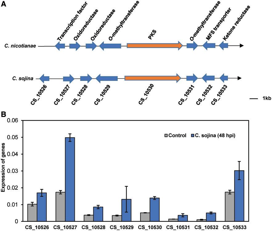 尾孢菌(Cercosporasojina)基因組編碼16個(gè)非核糖體肽合成酶(NRPS),20?個(gè)PKS,18個(gè)脂肪酸合成酶,3個(gè)萜烯合酶,2?個(gè)geranylgeranyl二磷酸合成酶和1種萜類化合物環(huán)化酶。這些酶參與次級代謝產(chǎn)物的合成,包括霉菌毒素,色素和生物堿。在C. sojina基因組中鑒定了一個(gè)具有8個(gè)尾孢菌素生物合成基因的類似基因簇。(圖4A)。這八個(gè)基因顯示高氨基酸序列與煙草(C. nicotianae)尾孢菌素生物合成基因的相似性在相同的串聯(lián)順序中(圖4A)。此外,我們觀察到感染期間8種基因的轉(zhuǎn)錄增加(圖4B)。