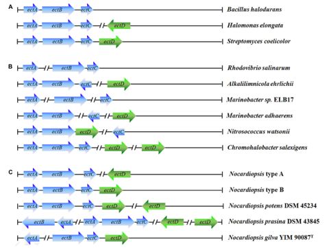 擬諾卡氏菌種是從鹽湖或堿性環(huán)境中分離出來(lái)的,其中有約三分之二的菌種嗜鹽或耐鹽。在高鹽環(huán)境下,擬諾卡氏菌可通過(guò)加固細(xì)胞壁和積累滲透因子等多種方式而使自身得以生存。鹽刺激條件下,滲透因子的累積可使得菌體在不影響其基本細(xì)胞進(jìn)程和常規(guī)代謝的情況下而保持菌體滲透平衡。其中在自然界含量最多的滲透因子便是四氫嘧啶,其可促進(jìn)蛋白折疊,并保護(hù)酶、核酸、抗體等生物分子,使細(xì)胞可應(yīng)對(duì)多種壓力環(huán)境。在所有的擬諾卡氏菌種中都有參與四氫嘧啶合成的相關(guān)基因。