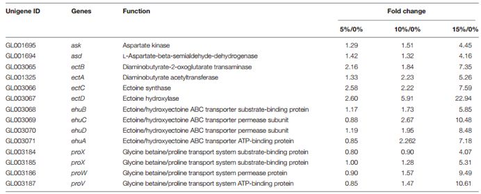 表1、在不同鹽濃度刺激下四氫嘧啶和羥基四氫嘧啶合成與轉(zhuǎn)運(yùn)基因的表達(dá)情況