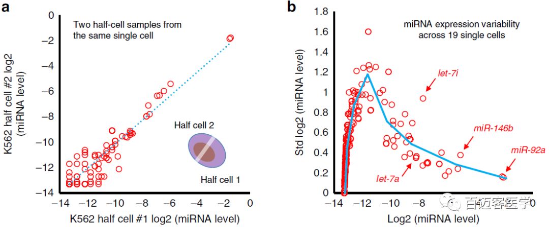 1、作者首先分別比較了來自同一細胞的半細胞單細胞microRNA測序和單細胞轉(zhuǎn)錄組測序之間的差異:該方法表現(xiàn)出良好的穩(wěn)健性(~95%成功率)和重現(xiàn)性(microRNA和mRNA的R2=0.93),產(chǎn)生可獨立驗證的成對半細胞microRNA和mRNA表達譜。