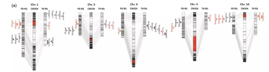 QTL定位結(jié)果:利用120個(gè)PD單株構(gòu)建的重測(cè)序遺傳圖譜和3個(gè)環(huán)境下的56個(gè)單株表型數(shù)據(jù)定位到22個(gè)QTL位點(diǎn)。其中LOD值最高的是PD-dicap1.1 (LOD=8.7),表型變異率(R2)最高的是PD-dicap10.2 (28.8%)。同樣地,85個(gè)TH單株構(gòu)建的簡(jiǎn)化圖譜和2個(gè)環(huán)境的表型數(shù)據(jù)定位到22個(gè)QTL位點(diǎn)。其中LOD值(LOD=9.9)和R2(18.8%)最高的都是TH-cap2.2。兩者分析時(shí)均用CM334作為參考基因組,因此可以對(duì)2個(gè)群體的QTL定位結(jié)果進(jìn)行比較,發(fā)現(xiàn)PD群體的9個(gè)QTL位點(diǎn)與TH群體的7個(gè)QTL位點(diǎn)的物理位置重疊。
