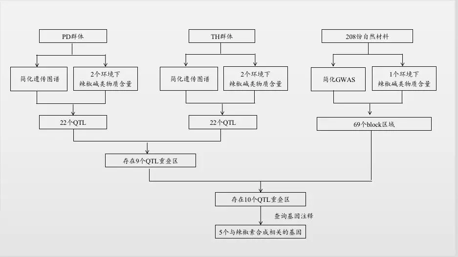聯(lián)合分析結(jié)果:基于相同的參考基因組,通過(guò)比較QTL分析與GWAS分析的定位結(jié)果的物理位置發(fā)現(xiàn)GWAS結(jié)果中10個(gè)區(qū)域與本研究QTL定位結(jié)果重疊,查詢注釋結(jié)果,發(fā)現(xiàn)5個(gè)基因與辣椒素生物合成途徑相關(guān)基因。