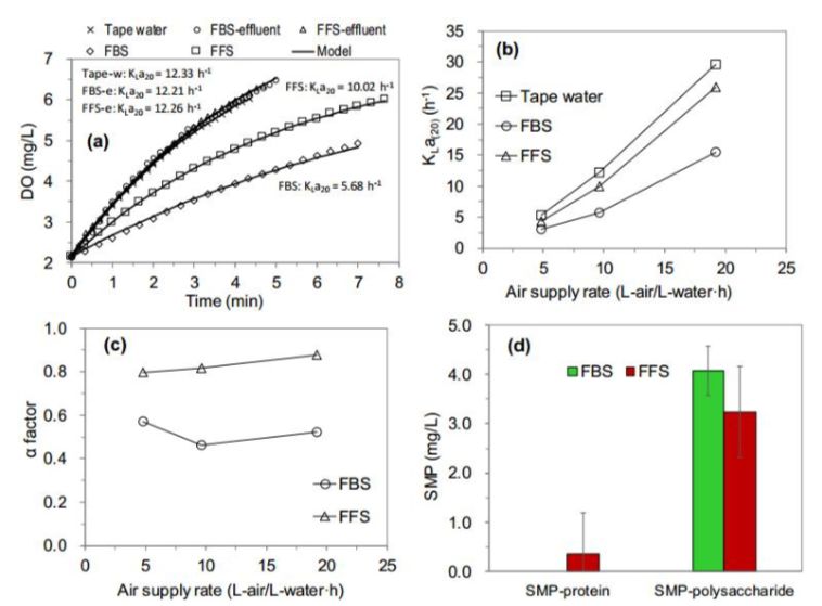 圖2.?(a)FBS及其排出水, FFS及其排出水,?自來水氧轉(zhuǎn)運(yùn)試驗(yàn)中的溶解氧濃度(mg/L);不同曝氣條件下,F(xiàn)BS和FFS的(b)KLa值;(c)α-因子值;(d)FBS和FFS的溶解性微生物產(chǎn)物(SMPs):蛋白和多糖濃度(mg/L)