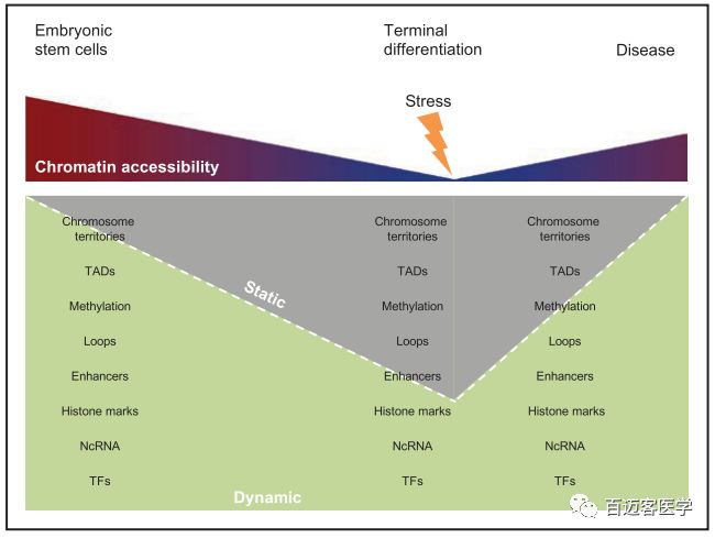 作者以此研究為基礎(chǔ),結(jié)合前人研究結(jié)果,構(gòu)建了發(fā)育和疾病發(fā)生中表觀基因組的變化模型(如下圖)。發(fā)育過程中伴隨著染色質(zhì)的變化,使最終分化的細胞具有穩(wěn)定的轉(zhuǎn)錄組,而疾病破壞了這種平衡,通過影響染色質(zhì)結(jié)構(gòu)、增強子-基因loop、組蛋白修飾、DNA甲基化等,將基因組的特定區(qū)域轉(zhuǎn)變?yōu)楦鼊討B(tài)的構(gòu)象。