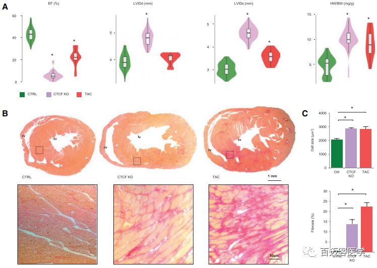 對CTCF-KO小鼠的表型呈現(xiàn)明顯的心肌病,失去CTCF會導致射血分數(shù)受損、左心室擴張以及器官和細胞水平的肌肉肥厚。而TAC小鼠也表現(xiàn)出肥厚,并伴有較輕微的心室大小和射血分數(shù)的變化,這表明CTCF-KO和TAC小鼠代表了不同的病理生理模型。
