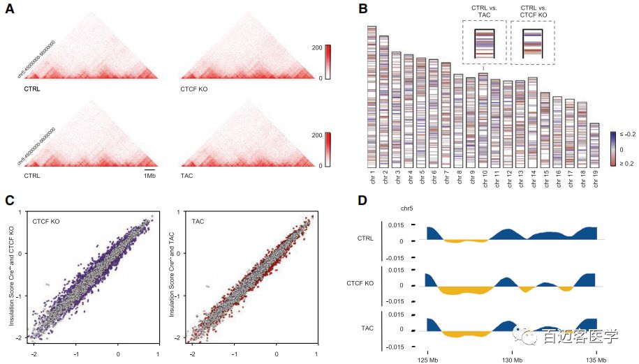 CTRL、CTCF-KO、TAC小鼠的TAD結(jié)構(gòu)分析顯示,三組的TAD數(shù)量分別為3686、3746和3705個,雖然整個基因組的TAD邊界數(shù)量變化小于2%,但是邊界強度發(fā)生了不同的變化。此外,CTCF-KO、TAC小鼠的染色體均有新的TAD邊界,包括發(fā)生邊界的轉(zhuǎn)移和新邊界的形成。