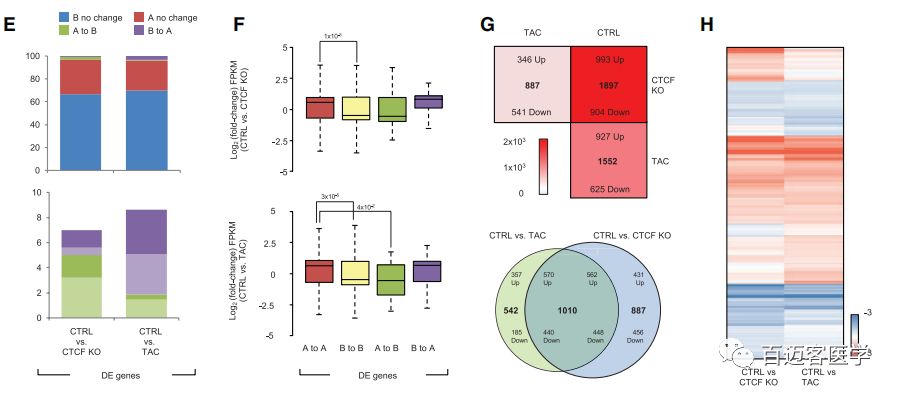 CTCF的缺失或TAC對染色體的A compartment和B?compartment的影響較小,而其中發(fā)生compartment轉(zhuǎn)換的區(qū)域與基因表達呈正相關(guān),即從A?compartment到B?compartment轉(zhuǎn)換區(qū)域的基因表達下調(diào),從B?compartment到A?compartment轉(zhuǎn)換區(qū)域的基因表達上調(diào)。CTCF-KO、TAC小鼠間存在41%的共有差異表達基因,兩者都表現(xiàn)出已知的標志基因激活。ChIP-seq檢測到CTCF靶向基因的轉(zhuǎn)錄起始位點,而這些基因富集在與心臟病相關(guān)的通路中。