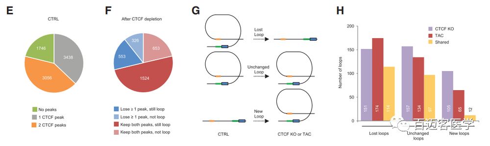 CTCF-KO、TAC小鼠的染色體長距離loop大小沒有明顯變化,但loop總數(shù)量減少。相比于對照組,CTCF-KO和TAC中消失的長距離loop中有51%兩者共有的,而新出現(xiàn)的loop中只有15%是兩者共有的;在疾病細胞中丟失的loop數(shù)大于新形成的loop數(shù)。在疾病細胞中發(fā)生重組(丟失/新形成)的loop中,富集與心血管功能相關(guān)通路中的基因。此外,重組loop中亦包含大量增強子–啟動子loop,其中在疾病細胞中丟失的loop富集與心臟病理相關(guān)的基因。