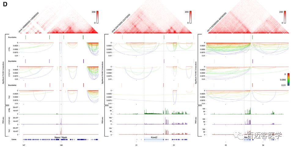 正常對照成年小鼠(CTRL)和兩個不同的疾病模型(TAC、CTCF-KO)小鼠的Hi-C結(jié)果揭示了5 kb分辨率下心肌細胞的基因組相互作用,得到了染色體內(nèi)和染色體間的互作事件,并為未來的心臟表觀基因組研究提供了依據(jù)。壓力超載或CTCF缺失選擇性地改變了TAD的邊界強度和A/B?compartment、基因組可及性。心力衰竭涉及致病基因周圍染色質(zhì)互作穩(wěn)定性的降低。此外,壓力超負荷或CTCF缺失重塑了心臟增強子的長距離互作,導致這些功能元件周圍局部染色質(zhì)互作顯著減少。