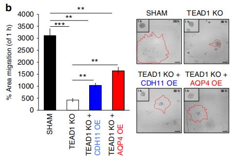 作者利用不同亞型人GBM腫瘤樣本,通過(guò)ChIP-PCR對(duì)TEAD1的候選靶基因進(jìn)行驗(yàn)證。進(jìn)一步結(jié)合TEAD1KO相比于對(duì)照的異種移植樣本中靶基因表達(dá)水平,EGFR、AQP4、CDH4在TEAD1KO樣本中表達(dá)下調(diào),因此,TEAD1可能是通過(guò)結(jié)合靶基因EGFR、AQP4、CDH4調(diào)控其表達(dá)進(jìn)而參與GBM遷移。