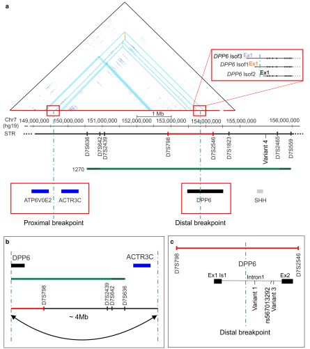 作者設(shè)計(jì)引物擴(kuò)增連鎖區(qū)域去證實(shí)這些變異,結(jié)果發(fā)現(xiàn)PCR產(chǎn)物在兩個(gè)7號(hào)染色體的位點(diǎn)比對(duì)到了相反的方向,且距離將近4Mb。7號(hào)染色體上的局部比對(duì),證實(shí)了反向雜合低拷貝重復(fù)的出現(xiàn)。遠(yuǎn)端的斷點(diǎn)位于7q36.2連鎖區(qū)域上,DPP6基因的1號(hào)內(nèi)含子上,被預(yù)測(cè)改變了基因的編碼序列;臨近的倒位斷點(diǎn)位于連鎖區(qū)域之外。