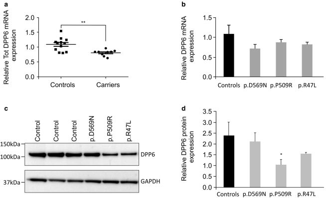 只有3個(gè)攜帶DPP6無(wú)義突變的患者的解剖大腦被凍存。這三個(gè)患者的神經(jīng)病理學(xué)診斷分別是阿爾茲海默癥AD,F(xiàn)TLD-TDP typeD(FTD行為變異和佩吉特氏骨病),F(xiàn)TLD-ALS type B(FTD行為變異及球類型)。結(jié)果發(fā)現(xiàn)三個(gè)DPP6變異(p.P509R, p.R47L, and p.D596N)?的mRNA表達(dá)水平顯著下調(diào),并且發(fā)現(xiàn)p.P509R和p.R47L 攜帶者的DPP6蛋白表達(dá)水平也顯著下降。