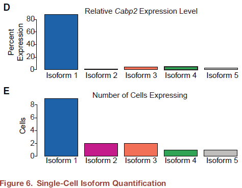 為了解決全長isoform結(jié)構(gòu),進(jìn)行了ONT全長轉(zhuǎn)錄組測序,并使用Illumina短reads序列數(shù)據(jù)作為確認(rèn)的scaffold,用于nonopore長讀長數(shù)據(jù)比對。與150-800bp片段大小的Illumina?reads不同,Nanopore測序不需要片段化文庫,并且可以產(chǎn)生跨越mRNA轉(zhuǎn)錄本長度的單一reads(圖6A和6B)。對p15時(shí)間點(diǎn)的12個(gè)OHC細(xì)胞加barcaod以在4個(gè)MinION?R9.4?flow?cell上測序所有樣品,同時(shí)保持單細(xì)胞分辨率(圖6A)。因?yàn)镺HCs是最多和最差異的Illumina數(shù)據(jù)集,這有助于跨平臺比較以驗(yàn)證長reads和isoform定量。