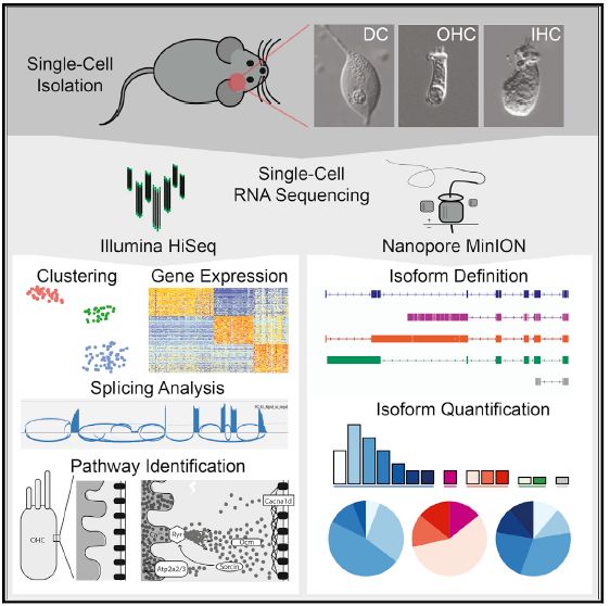 2、SmartSeq2單細(xì)胞擴(kuò)增,IHC?(n?=?42),?OHC?(n?=?127),?and?DC?(n?=?39)進(jìn)行二代Illumina平臺轉(zhuǎn)錄組測序;12個(gè)p15小鼠OHCs進(jìn)行ONT全長轉(zhuǎn)錄組測序。